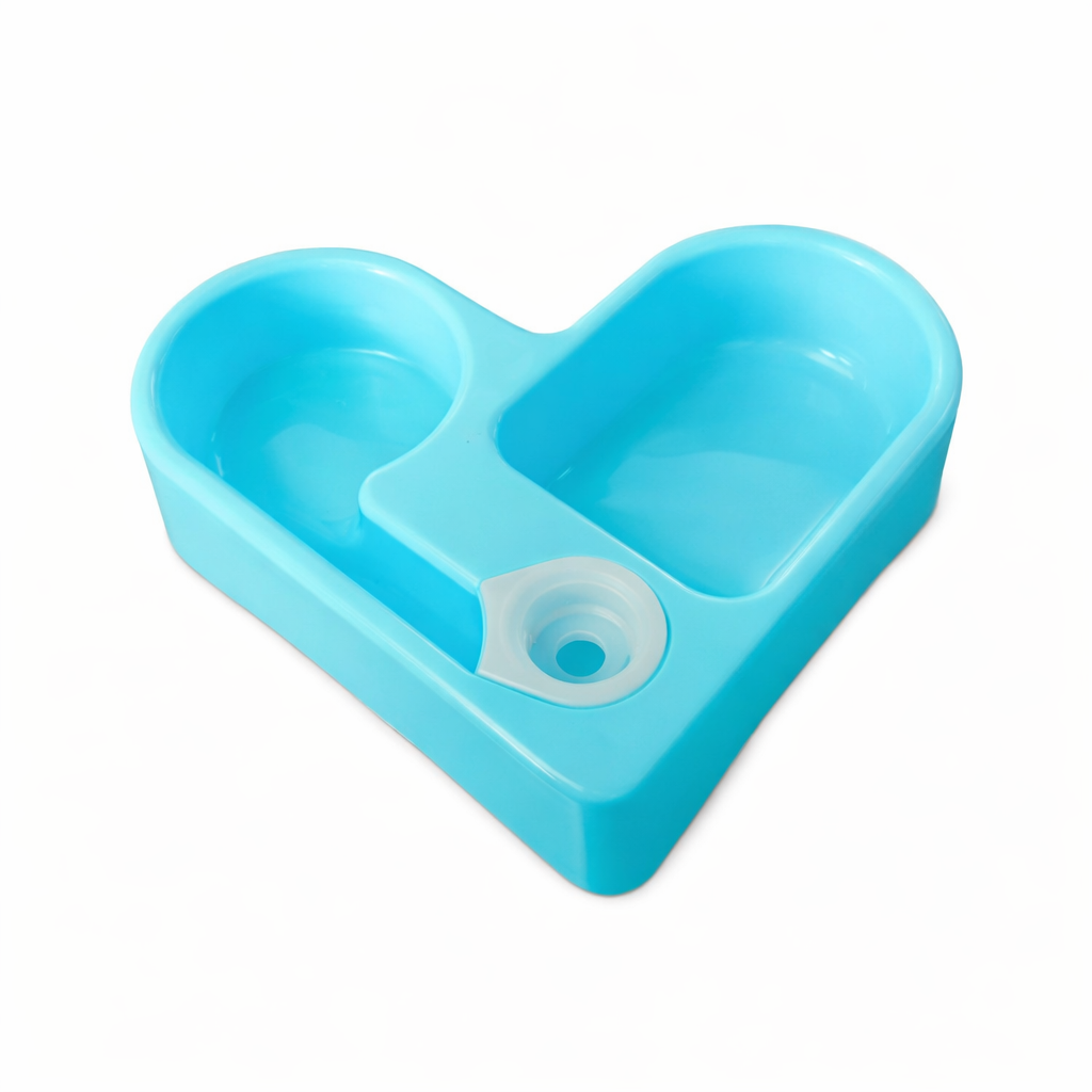 Comedouro plástico duplo em formato de coração, ideal para oferecer água e ração ao mesmo tempo.